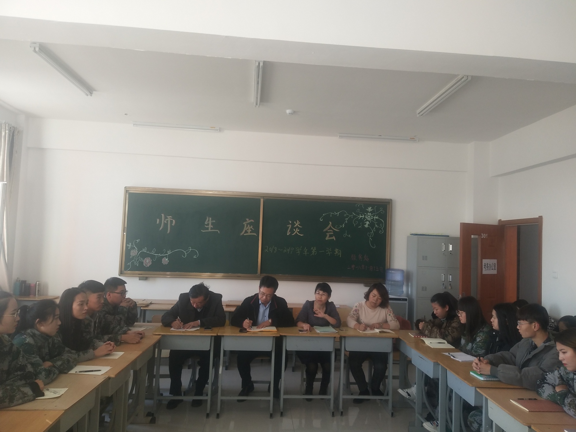 為了加強(qiáng)教學(xué)管理,提高教學(xué)質(zhì)量,進(jìn)一步了解全校的教學(xué)狀況和學(xué)生的學(xué)習(xí)情況、增進(jìn)師生情感,11月15日星期四下午, 教務(wù)處組織召開2018--2019學(xué)年第一學(xué)期期中教學(xué)檢查師生座談會(huì),對(duì)開學(xué)以來(lái)的教學(xué)情況進(jìn)行交流。參加座談會(huì)的有教學(xué)副院長(zhǎng)謝飛、教務(wù)處處長(zhǎng)劉國(guó)華、教務(wù)處全體人員、任課教師和各班級(jí)的教務(wù)助理。座談會(huì)由教務(wù)處處長(zhǎng)劉國(guó)華主持。劉處長(zhǎng)首先說(shuō)明座談的目的是針對(duì)過(guò)去半學(xué)期教與學(xué)進(jìn)行總結(jié)反思,教師與自己所教學(xué)生面對(duì)面充分交流,尋找合適的教學(xué)方法與學(xué)習(xí)方法,以及在學(xué)習(xí)和生活中遇到的其他問(wèn)題。