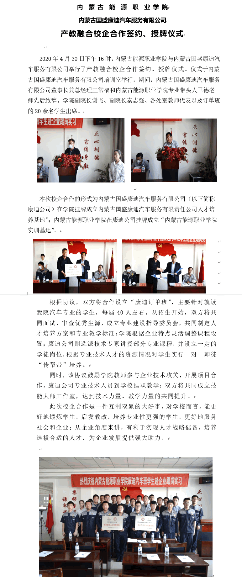 內(nèi)蒙古國(guó)盛康迪汽車(chē)服務(wù)有限公司與產(chǎn)教融合校企合作簽約、授牌儀式
