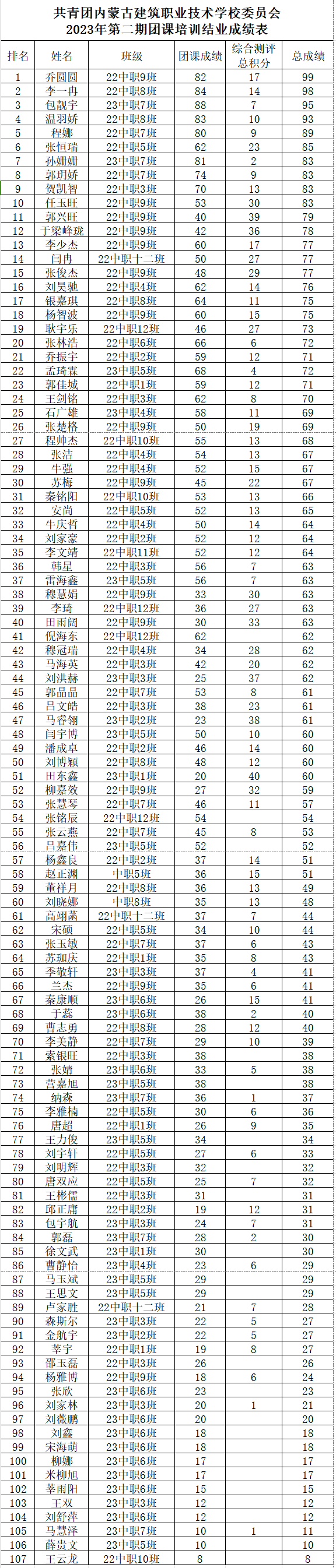 共青團(tuán)內(nèi)蒙古建筑職業(yè)技術(shù)學(xué)校委員會(huì)2023年第二期團(tuán)課培訓(xùn)結(jié)業(yè)成績(jī)公示