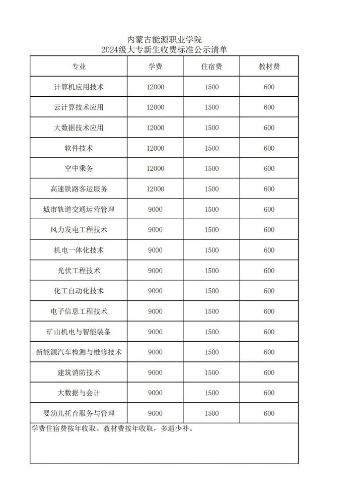 內(nèi)蒙古能源職業(yè)學(xué)院2024級大專新生收費(fèi)標(biāo)準(zhǔn)公示清單