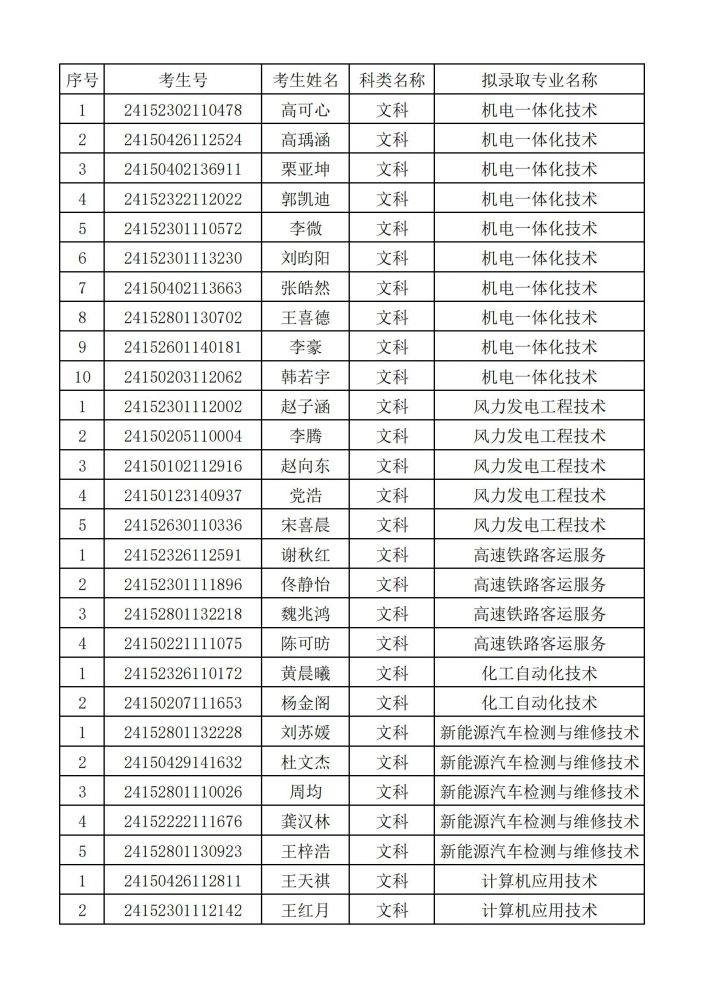 根據(jù)《關(guān)于做好2024年高等職業(yè)院校單獨(dú)考試招生工作的通知》(內(nèi)教招考普〔2024〕3號)的文件精神和《內(nèi)蒙古能源職業(yè)學(xué)院2024年單獨(dú)招生實(shí)施方案》的工作安排。根據(jù)專業(yè)志愿清錄取原則,2024年單獨(dú)考試招生工作領(lǐng)導(dǎo)小組對我校2024年單獨(dú)考試招生錄取名單進(jìn)行審核,經(jīng)審核,決定對225名考生擬錄取,現(xiàn)予以公示。待內(nèi)蒙古教育招生考試中心審核后,正式錄取名單在內(nèi)蒙古招生考試信息網(wǎng)公布。
