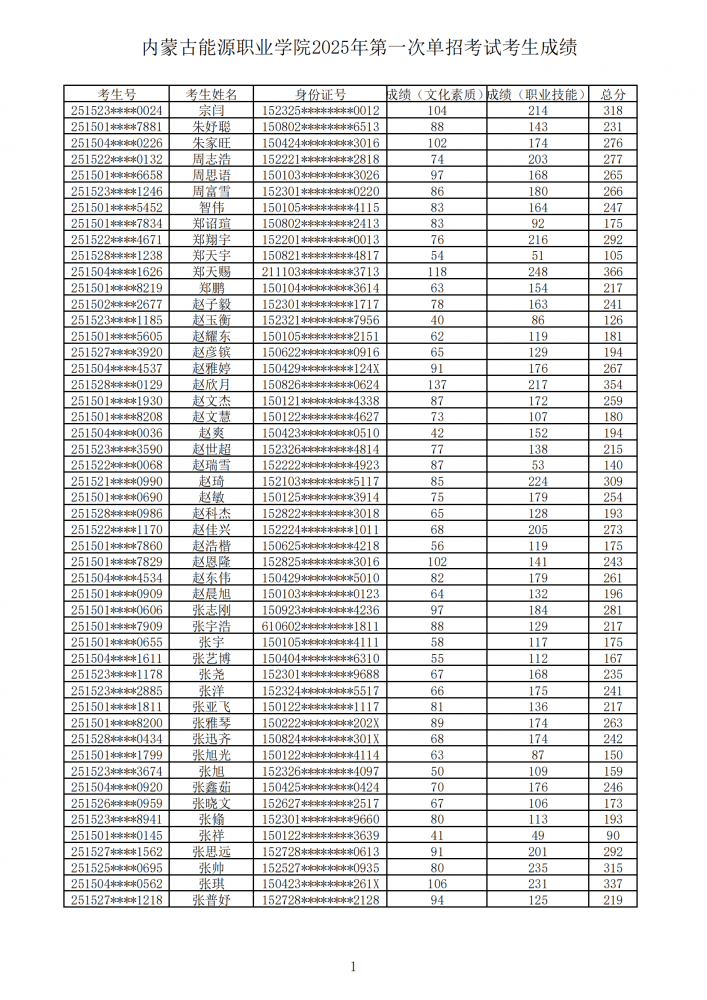 內(nèi)蒙古能源職業(yè)學(xué)院2025年第一次單獨招生考試成績