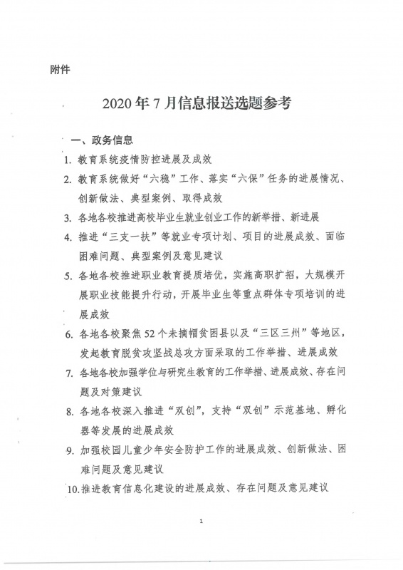 各部門: 根據(jù)辦公廳信息處文件要求,擬訂7月信息報(bào)送選題參考(見附件)?! ≌?qǐng)結(jié)合選題,對(duì)相關(guān)工作進(jìn)展成效、創(chuàng)新做法、典型案例、困難問題、意見建議等進(jìn)行總結(jié)梳理、分析研判。所報(bào)稿件應(yīng)層次清晰、情況清楚、文字簡(jiǎn)練。稿件篇幅原則上不超過3000字,鼓勵(lì)采用數(shù)據(jù)、圖表等說明情況。請(qǐng)各部門高度重視、積極投稿,并于2020年7月25日前通過電子郵件報(bào)送信息中心。聯(lián)系人:庫欣哲電子郵件:15212402@...
