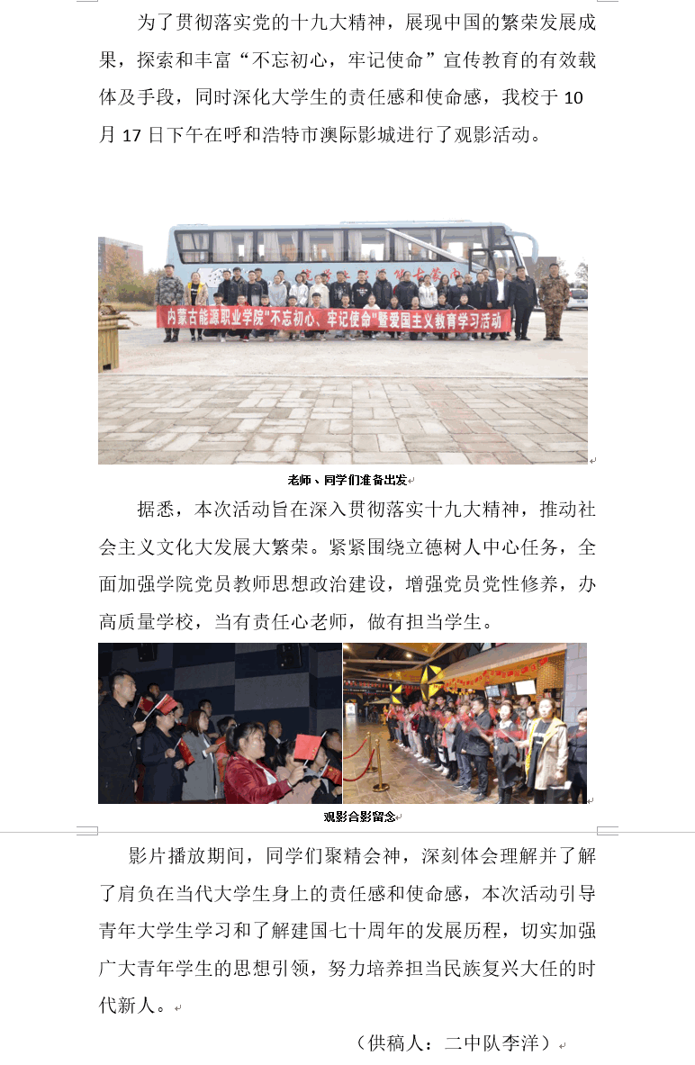 開(kāi)展“不忘初心、牢記使命”主題教育,是新時(shí)代堅(jiān)持和加強(qiáng)黨的全面領(lǐng)導(dǎo)、全面從嚴(yán)治黨、推進(jìn)新的偉大工程的內(nèi)在要求。根據(jù)上級(jí)黨委部署及團(tuán)市委要求,現(xiàn)制定我院“不忘初心,牢記使命”主題教育活動(dòng)方案。學(xué)院將于2019年10月17日下午組織觀看獻(xiàn)禮70周年愛(ài)國(guó)主義教育影片《我和我的祖國(guó)》。一、活動(dòng)目的:緊緊圍繞立德樹(shù)人中心任務(wù),全面加強(qiáng)學(xué)院黨員教師思想政治建設(shè),增強(qiáng)黨員黨性修養(yǎng),辦高質(zhì)量學(xué)校,當(dāng)有責(zé)任心老師...