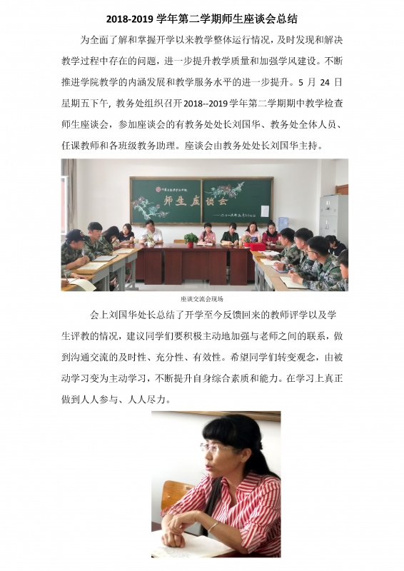 3月25日上午,教務(wù)處利用課間操時間,在教師休息室組織召開了任課教師座談會,參加本次會議的有副院長謝飛,教務(wù)處處長劉國華和各位任課教師。會議由劉國華處長主持。會上劉處長對學(xué)院當(dāng)前的教學(xué)情況做了簡要分析,鼓勵各位老師對學(xué)院的教學(xué)質(zhì)量提升工作積極建言獻策,希望老師們嚴(yán)格管理課堂紀(jì)律,并積極探索新的教學(xué)方式方法,激發(fā)學(xué)生學(xué)習(xí)興趣、活躍課程氣氛,改善課堂教學(xué)效果從而提高教學(xué)質(zhì)量。謝院長向老師們介紹了當(dāng)前...