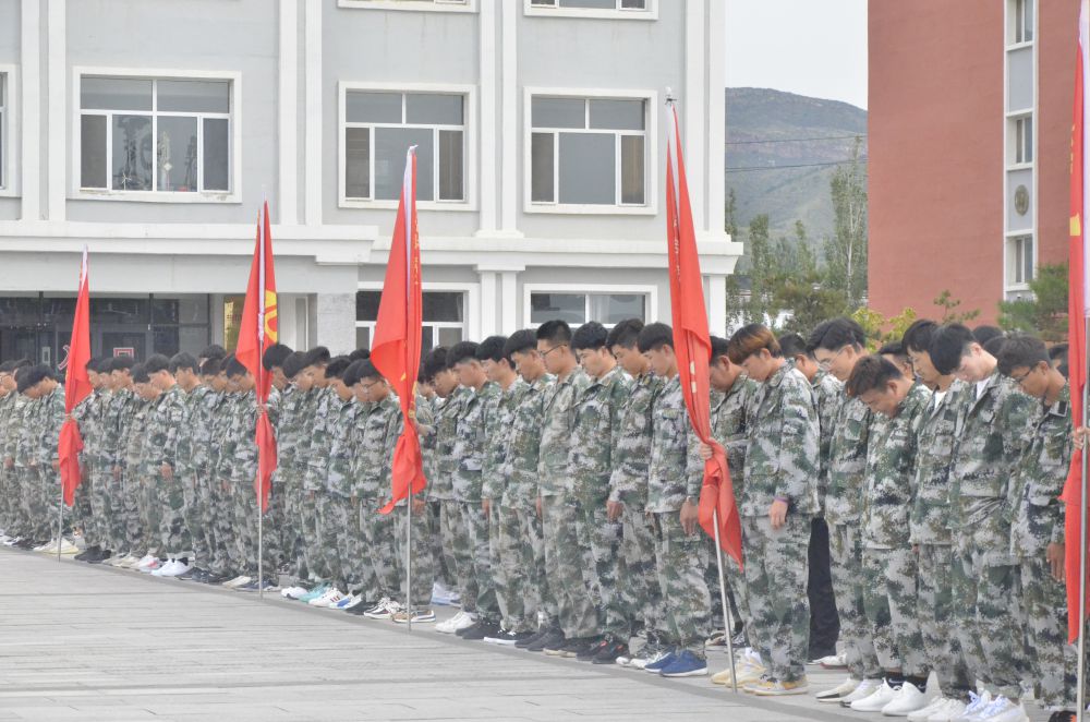 八一廣場,國旗半降,警報聲、鳴笛聲此起彼伏,全院師生低頭默哀。
