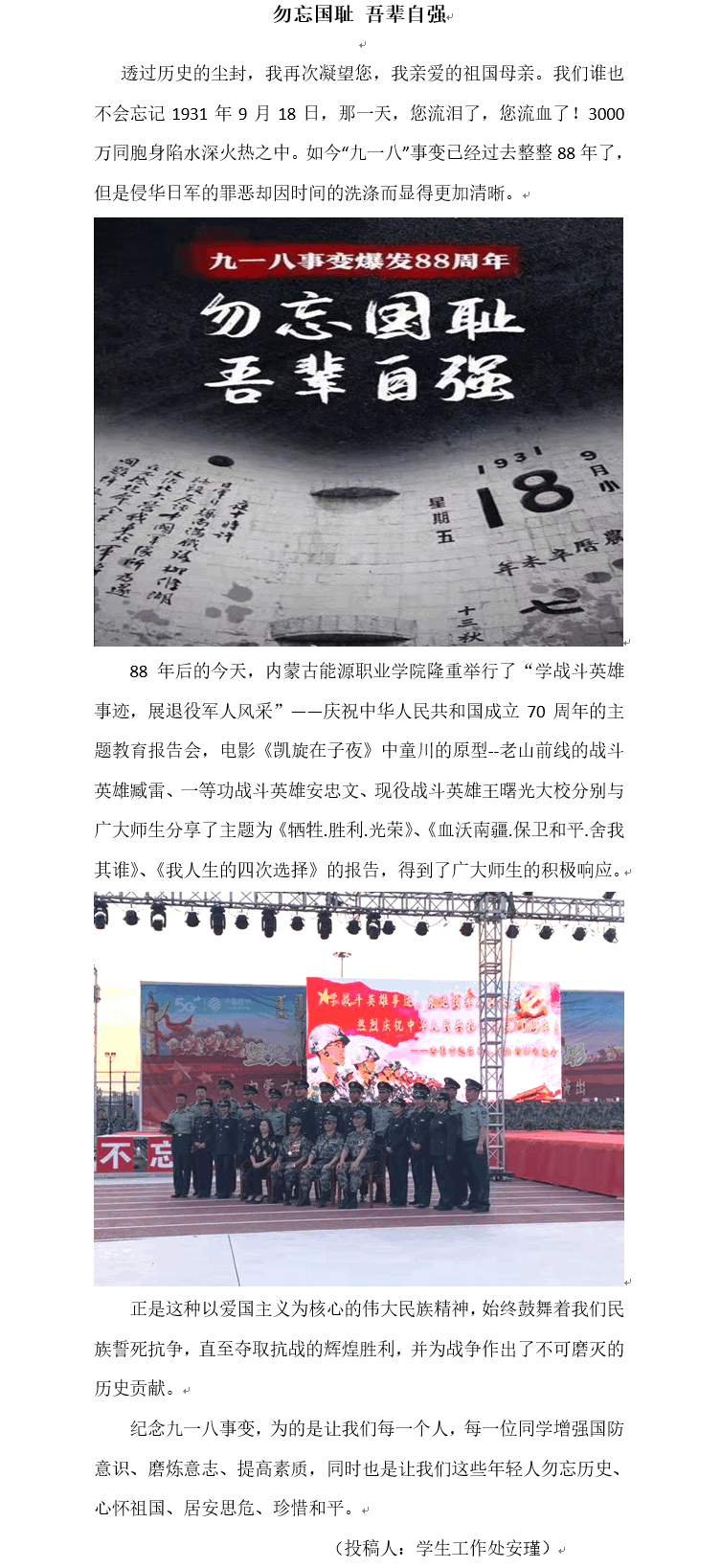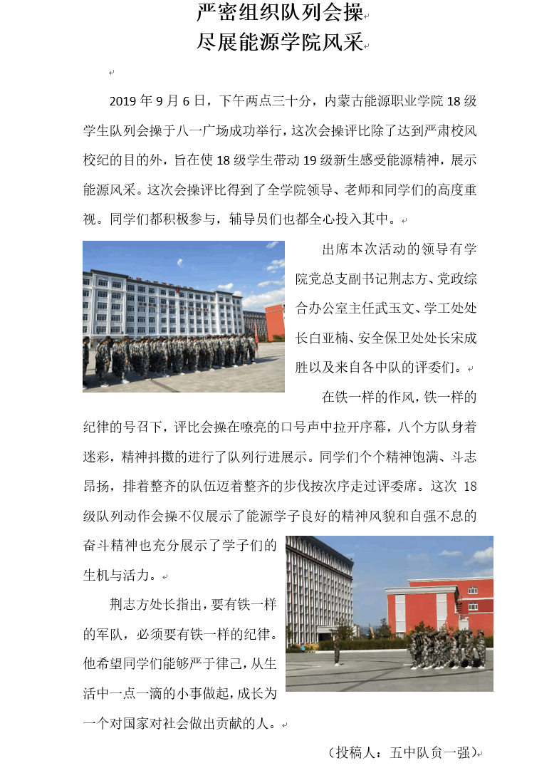 金秋時(shí)節(jié),丹桂飄香。攜著第一縷朝陽(yáng),內(nèi)蒙古能源職業(yè)學(xué)院全院師生迎來(lái)了第一次升旗儀式。據(jù)悉,每周一的清晨,學(xué)院各單位隊(duì)列整齊秩序井然走向國(guó)旗臺(tái)升旗位置。升國(guó)旗活動(dòng)是學(xué)院對(duì)學(xué)生進(jìn)行愛(ài)國(guó)思想政治教育的一項(xiàng)重要活動(dòng)。長(zhǎng)期以來(lái),我院堅(jiān)持弘揚(yáng)和踐行社會(huì)主義核心價(jià)值觀教育,始終把國(guó)旗班作為載體不斷推進(jìn)愛(ài)國(guó)主義教育實(shí)踐。從成立至今,學(xué)院國(guó)旗班以青春和熱血捍衛(wèi)著國(guó)旗尊嚴(yán),以責(zé)任和堅(jiān)守成為了能源學(xué)院一道亮麗的風(fēng)景線...