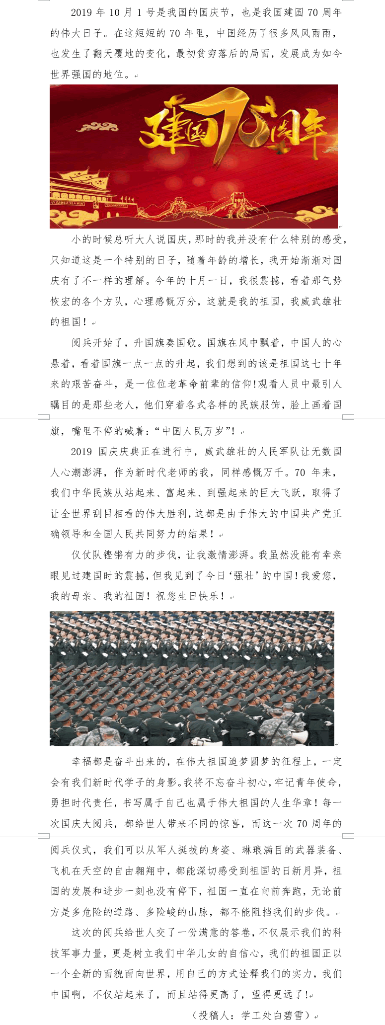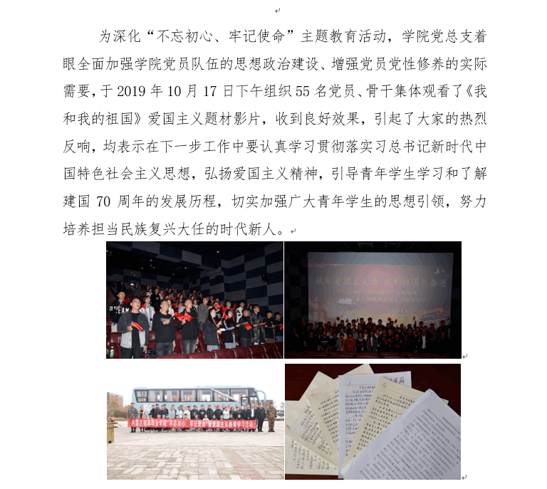 開(kāi)展“不忘初心、牢記使命”主題教育,是新時(shí)代堅(jiān)持和加強(qiáng)黨的全面領(lǐng)導(dǎo)、全面從嚴(yán)治黨、推進(jìn)新的偉大工程的內(nèi)在要求。根據(jù)上級(jí)黨委部署及團(tuán)市委要求,現(xiàn)制定我院“不忘初心,牢記使命”主題教育活動(dòng)方案。學(xué)院將于2019年10月17日下午組織觀看獻(xiàn)禮70周年愛(ài)國(guó)主義教育影片《我和我的祖國(guó)》。一、活動(dòng)目的:緊緊圍繞立德樹(shù)人中心任務(wù),全面加強(qiáng)學(xué)院黨員教師思想政治建設(shè),增強(qiáng)黨員黨性修養(yǎng),辦高質(zhì)量學(xué)校,當(dāng)有責(zé)任心老師...